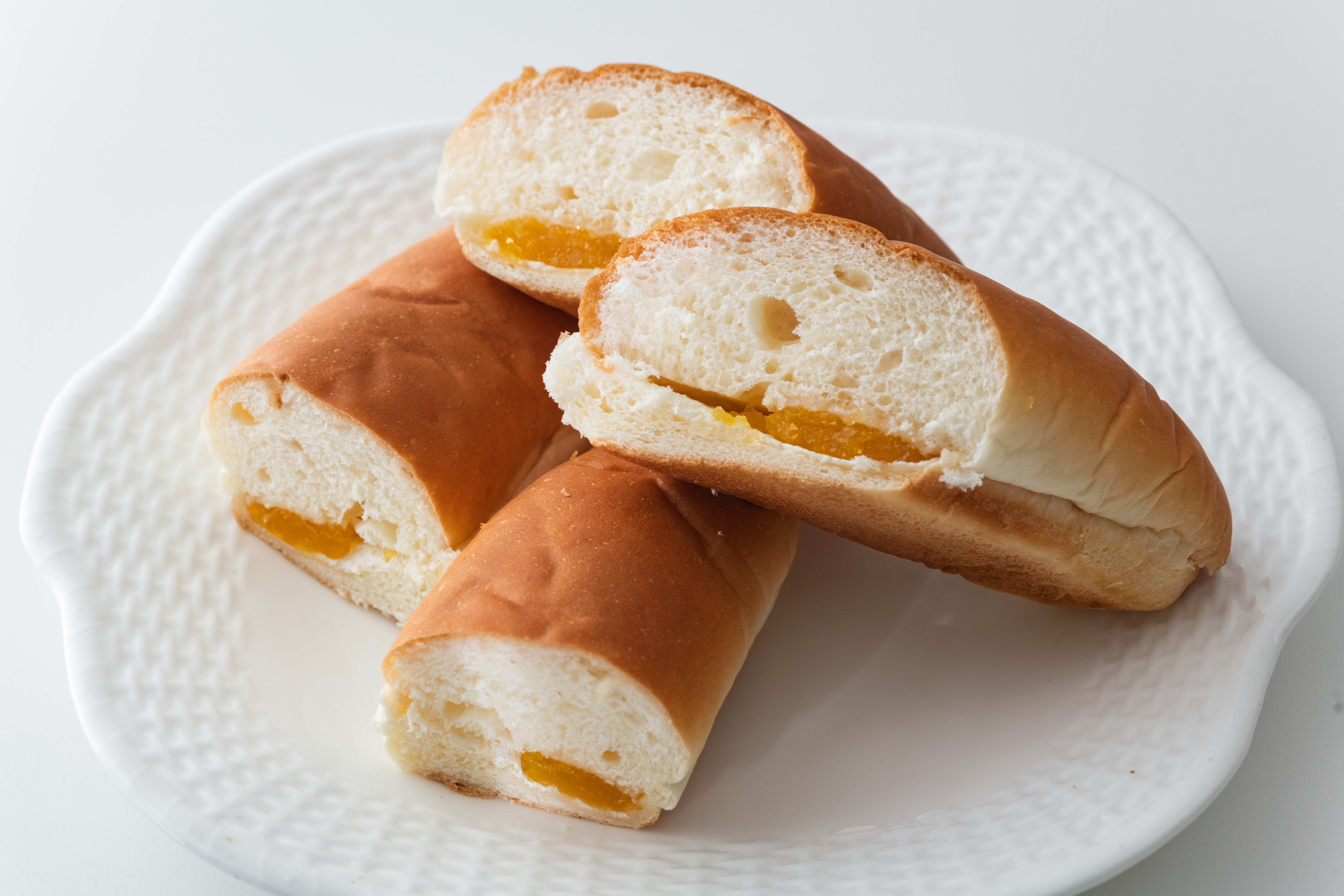 ③  食パン(4枚すべて)の片面に1のクリームを塗り広げ(中央は多め、端は薄めに)、中央に半分に割ったみかんを縦に並べてのせ、端に房ごとに分けたみかんを等分してのせる。それぞれもう1枚の食パンではさみ、ラップで包んで冷蔵庫で3時間以上冷やす。
