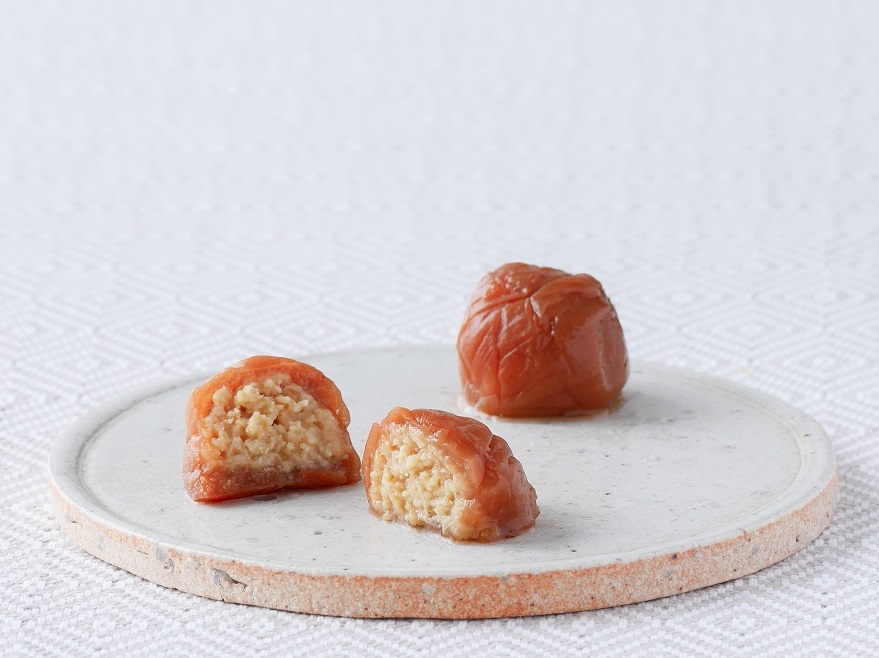 使用する素材には、本州最南端の串本町の美しい海で、梅酢エキスと紀州備長炭を配合したこだわりの飼料で育てられたブランド真鯛「紀州梅まだい」を用い、梅は肉厚で大粒の紀州南高梅のみを厳選しています。鯛の身を果肉の柔らかな南高梅で包む工程は、すべて職人によって一粒ずつ丁寧に手作業で行われます。繊細な造形と常温保存を可能にする製法の確立には、長い試行錯誤が重ねられてきました。素材選びから仕上げまで、一切の妥協を許さない姿勢が、この一粒の完成度を支えています。